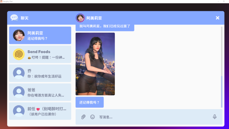 Naughty Chat 是一款文字聊天模拟游戏,你需要帮助一位名叫阿梅莉亚的女孩完成她的硕士论文。幸运的是,你正好是最适合帮她的人……