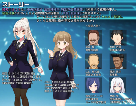 为了执行极密任务,她被派遣到某个边境地方的统制区“军警刑事课”。游戏以这个城镇为舞台,通过完成各种事件的クエスト型RPG。樱花能平安地夺回街道的和平吗?