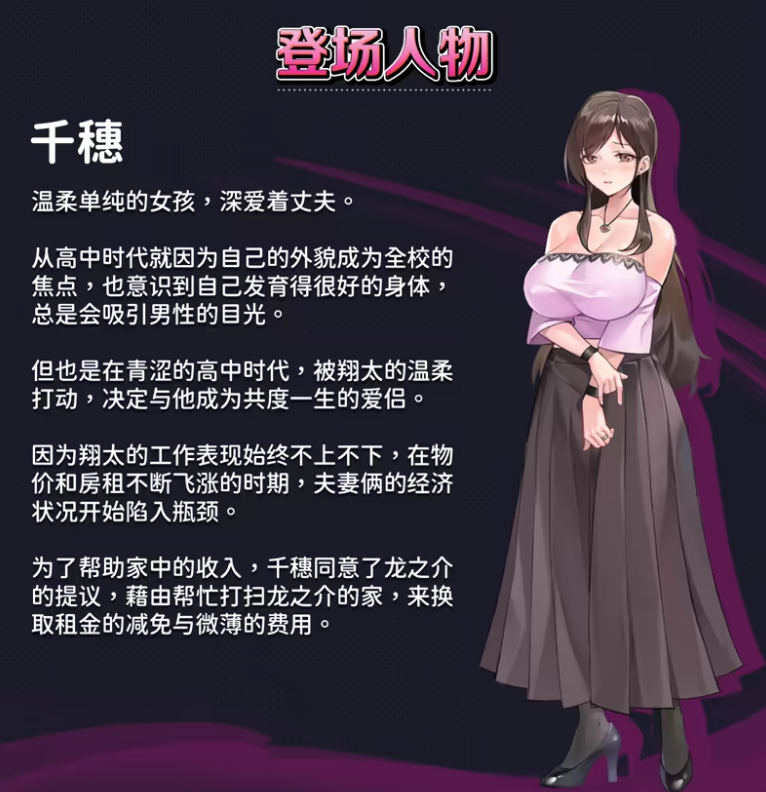 为经济状况所困的新婚夫妻—千穗与翔太,偶然间成为了「你」,少房东龙之介新的房客。千穗与翔太是从大学就开始交往,新婚的生活每天都充满了甜蜜。尽管翔太在工作上频频碰壁,两人还是用微薄的薪水相依为命。当千穗出现在你的门口时,你立刻被她那硕大的胸部,完美的身体曲线,还有一看就未经世事的单纯笑容给搞得血脉喷张。于是在小夫妻因为听到房租价格而却步时,你主动提出了一个方案。
